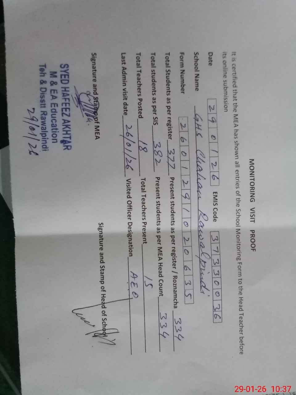 | Remarks (Use Separate Page if Required): Teacher Umar Ashfaq PST Science Maths has been removed from service since 23rd September 2023 while his name is still being shown in pmiu and sis both apps No NSB Account opened yet All credit of NSB is being credited in FTF account Students of class 1 listed in pmiu app are not updated 02 students Haq Nawaz and Zain Ali are in class Nursery while they are being shown in class 1 At one side boundary wall is dangerous it is twilted outside | |||||
