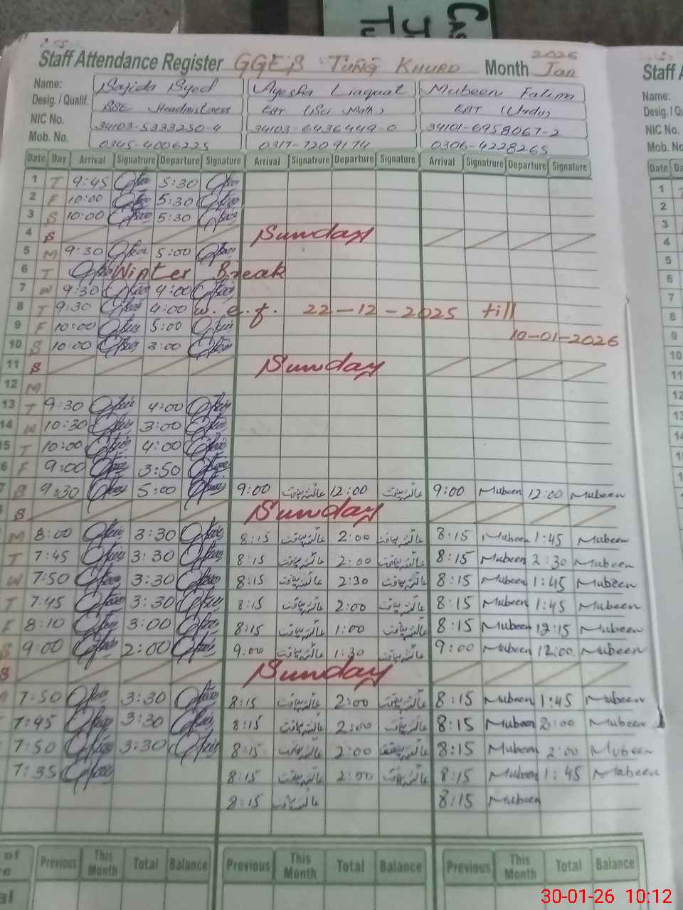 | CNIC | Full Name | Designation | R/C | Absence During Last Calender Month |