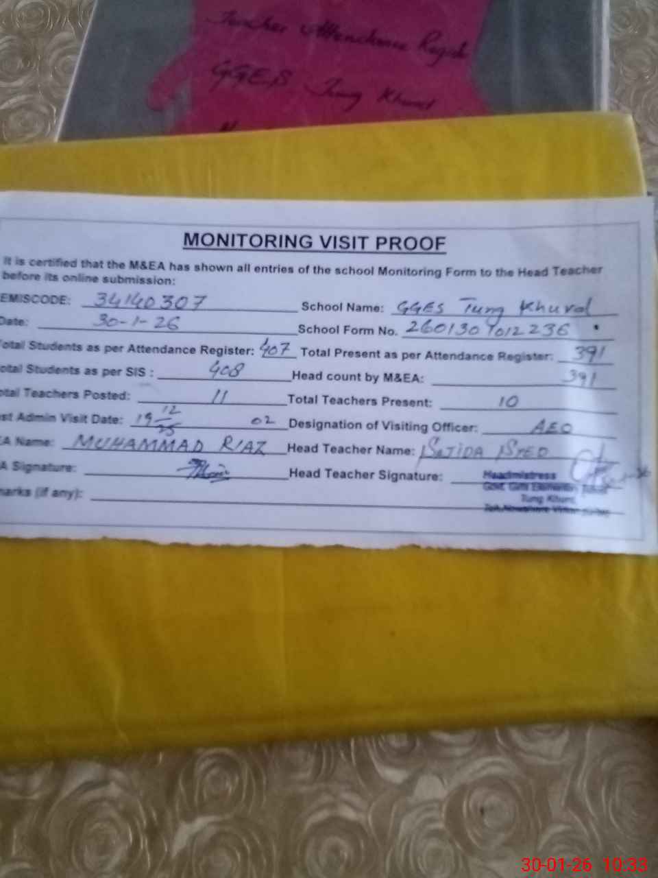 | Attendance Register | Head Teacher | MEA with School | Visit Proof |
