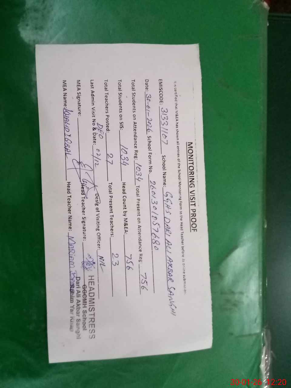 | Attendance Register | Head Teacher | MEA with School | Visit Proof |