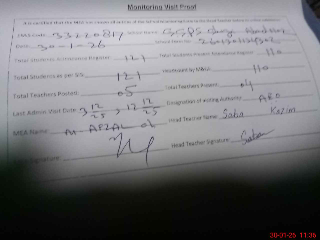 | Attendance Register | Head Teacher | MEA with School | Visit Proof |