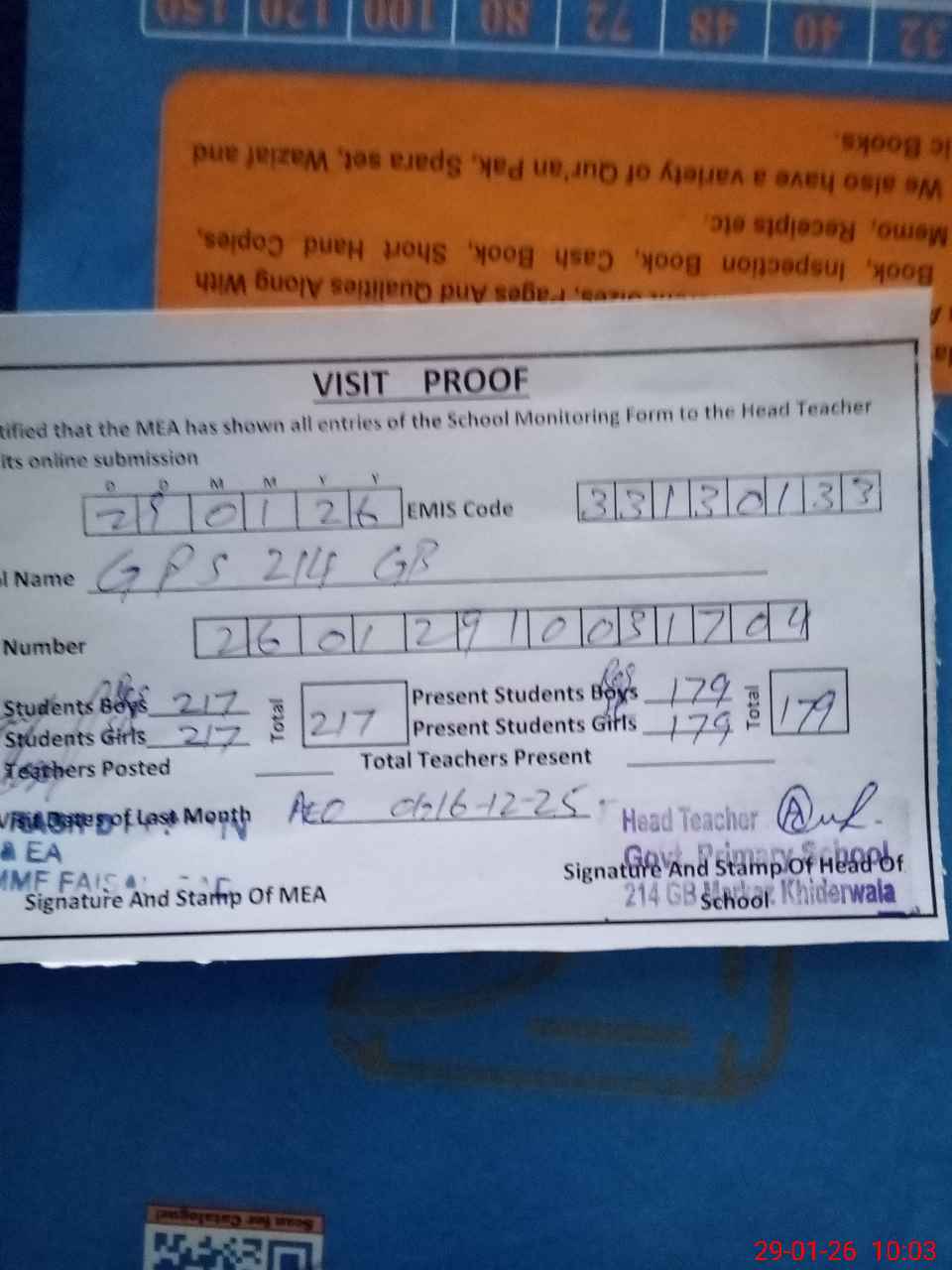 | Attendance Register | Head Teacher | MEA with School | Visit Proof |