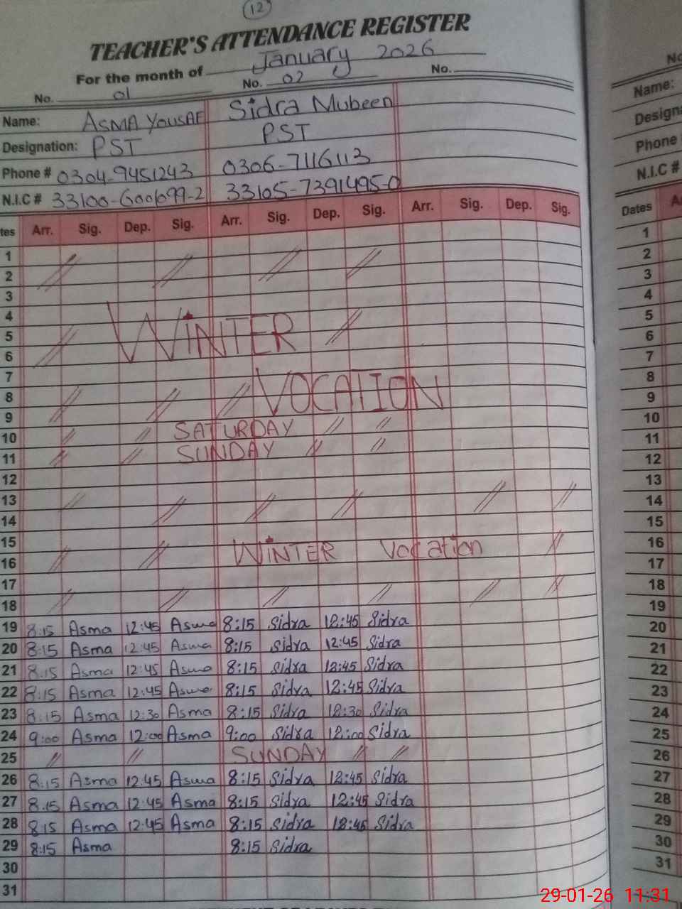 | CNIC | Full Name | Designation | R/C | Absence During Last Calender Month |