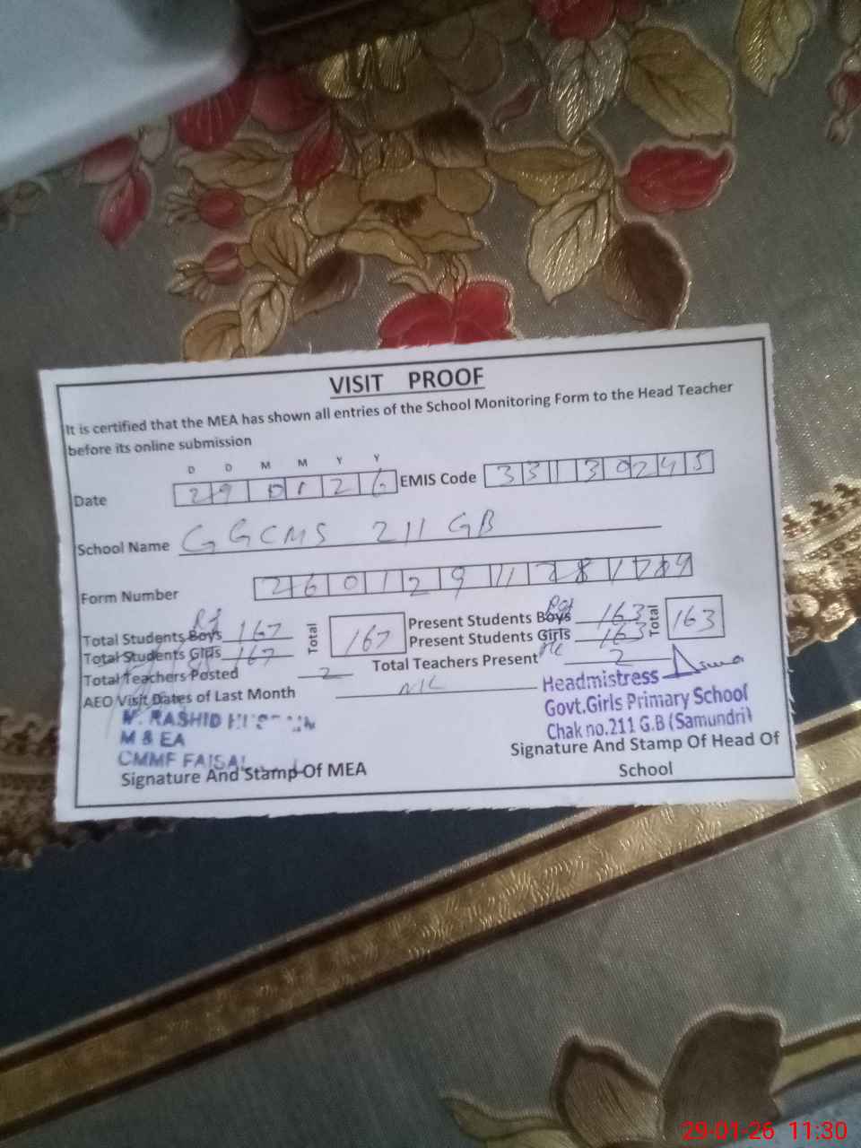 | Attendance Register | Head Teacher | MEA with School | Visit Proof |