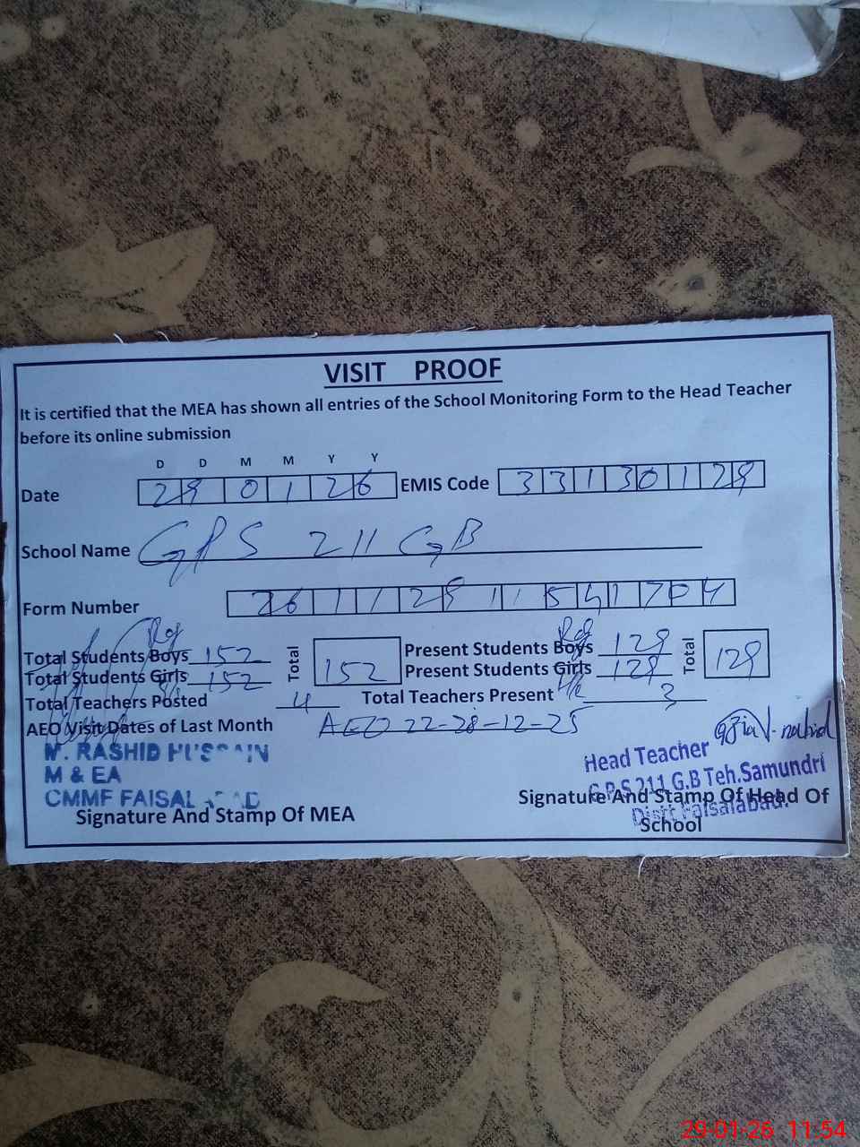 | Attendance Register | Head Teacher | MEA with School | Visit Proof |