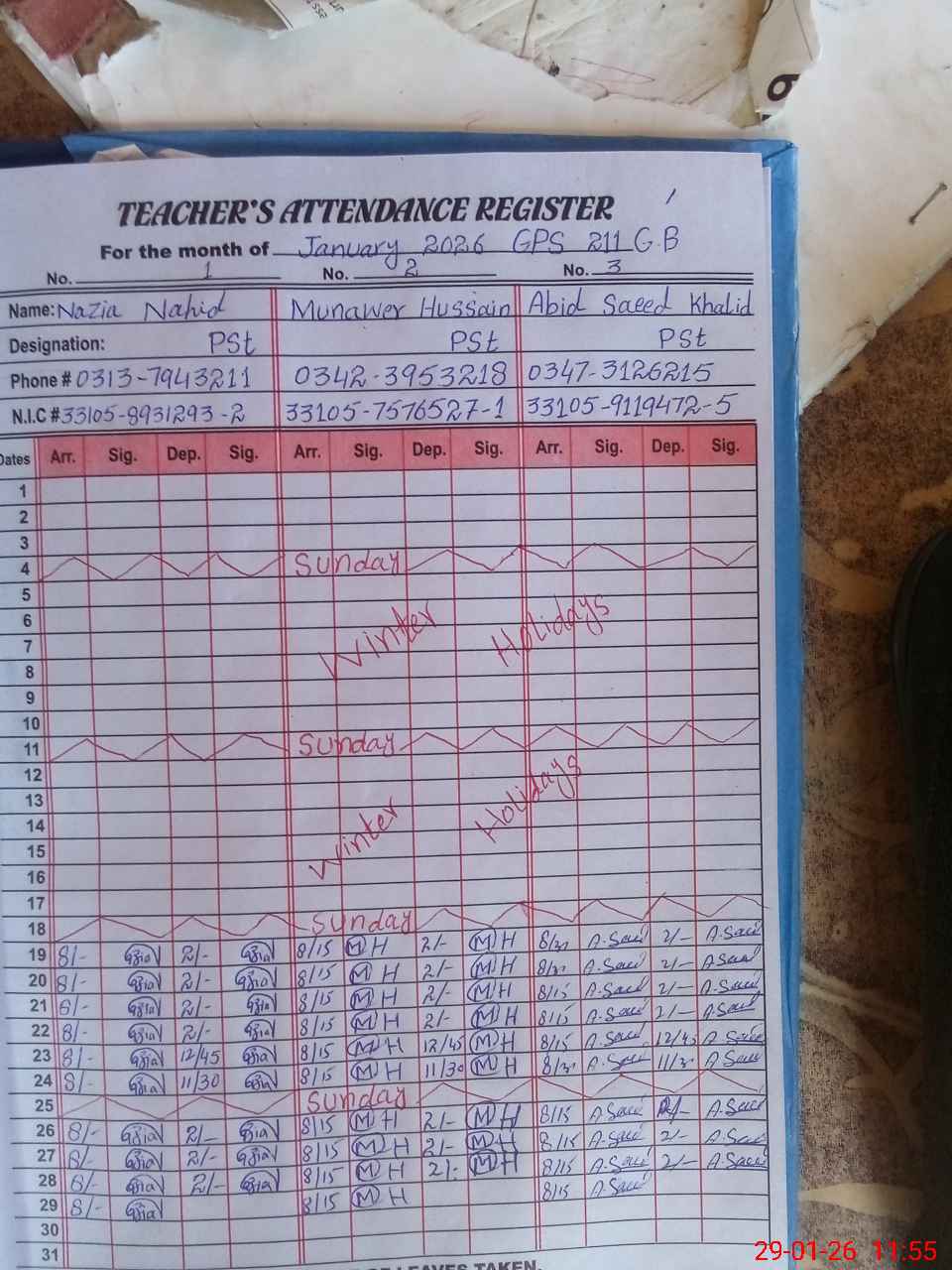 | CNIC | Full Name | Designation | R/C | Absence During Last Calender Month |