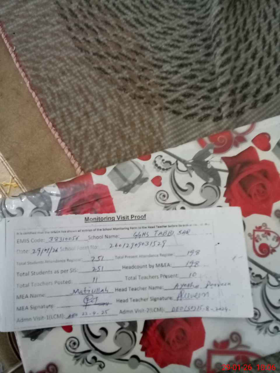 | Total no. of Classrooms: 10 No. of Classrooms Used for Teaching: 8 No. of Classrooms Storing Old Furniture, FTBs, etc: 0Comments if Any: Two classrooms partially dangerous three toilets nonfunctional soap not available at all wash points Night Yasmeen EST absent and it's attendance dated 27 and 28 January also not endorse on teacher attendance register Clark Hafiz Ahmad Hassan also absen |