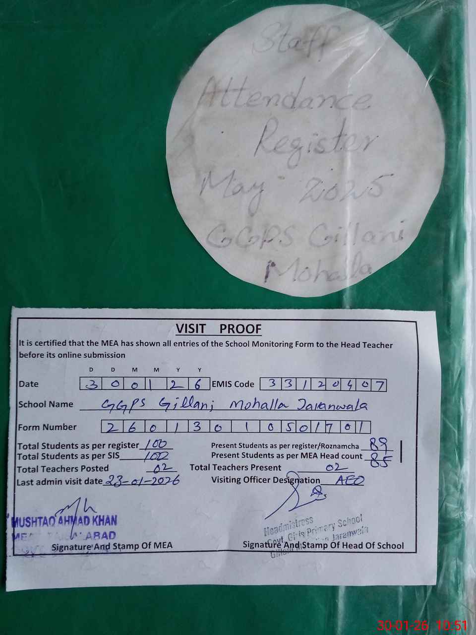 | Attendance Register | Head Teacher | MEA with School | Visit Proof |