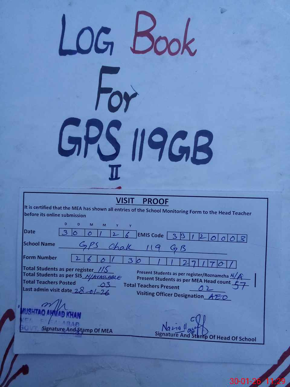 | Attendance Register | Head Teacher | MEA with School | Visit Proof |