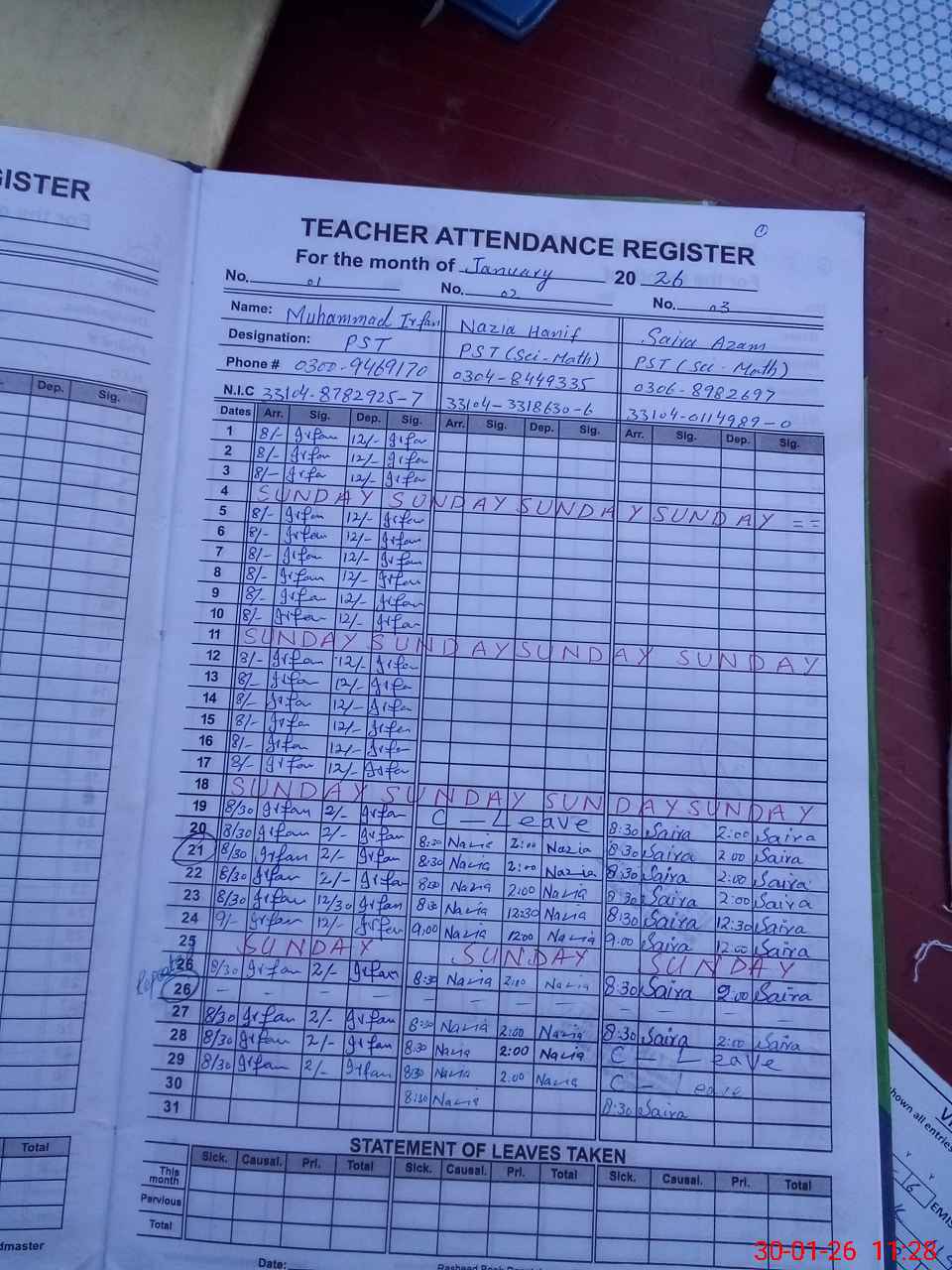 | CNIC | Full Name | Designation | R/C | Absence During Last Calender Month |