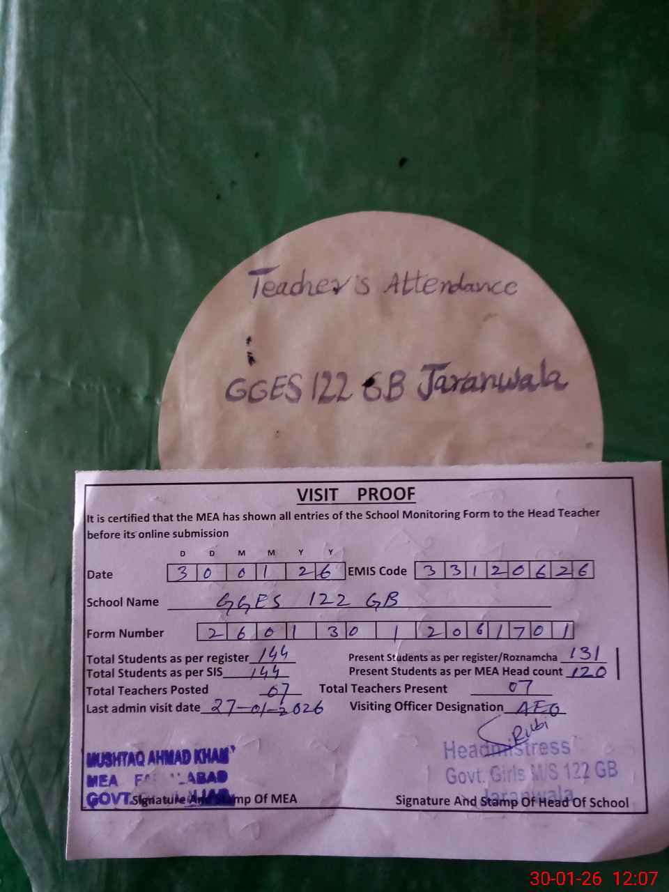 | Attendance Register | Head Teacher | MEA with School | Visit Proof |