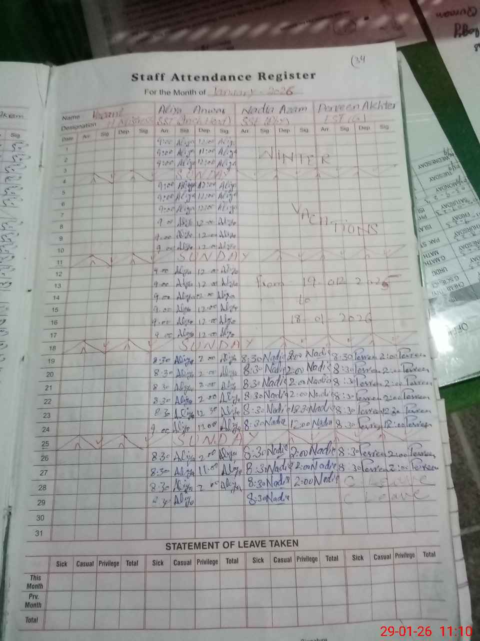 | Leave | Duty | Absent | Maternity | Medical | Ex- Pak |