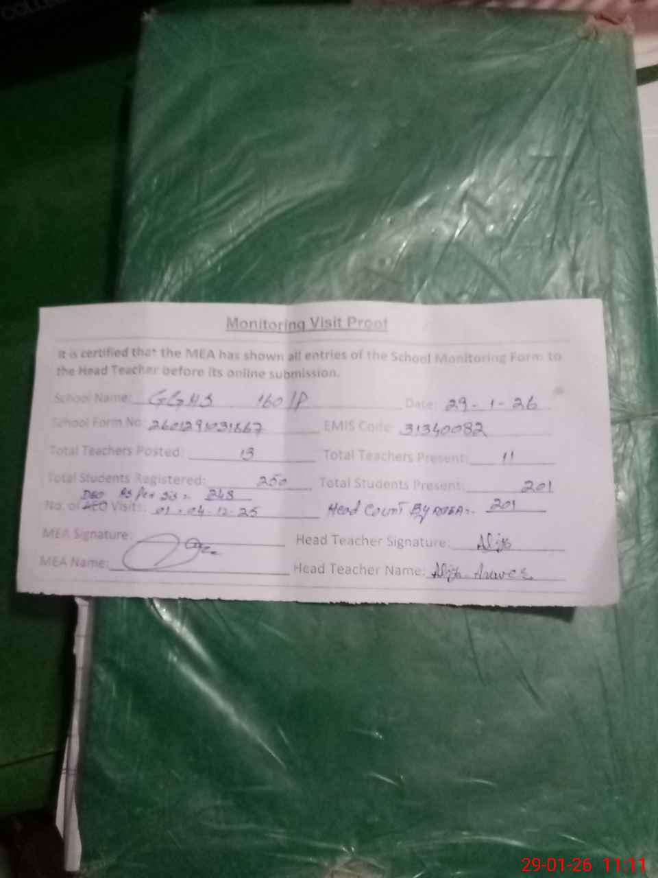 | Attendance Register | Head Teacher | MEA with School | Visit Proof |