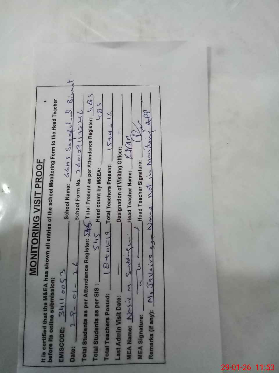 | Attendance Register | Head Teacher | MEA with School | Visit Proof |