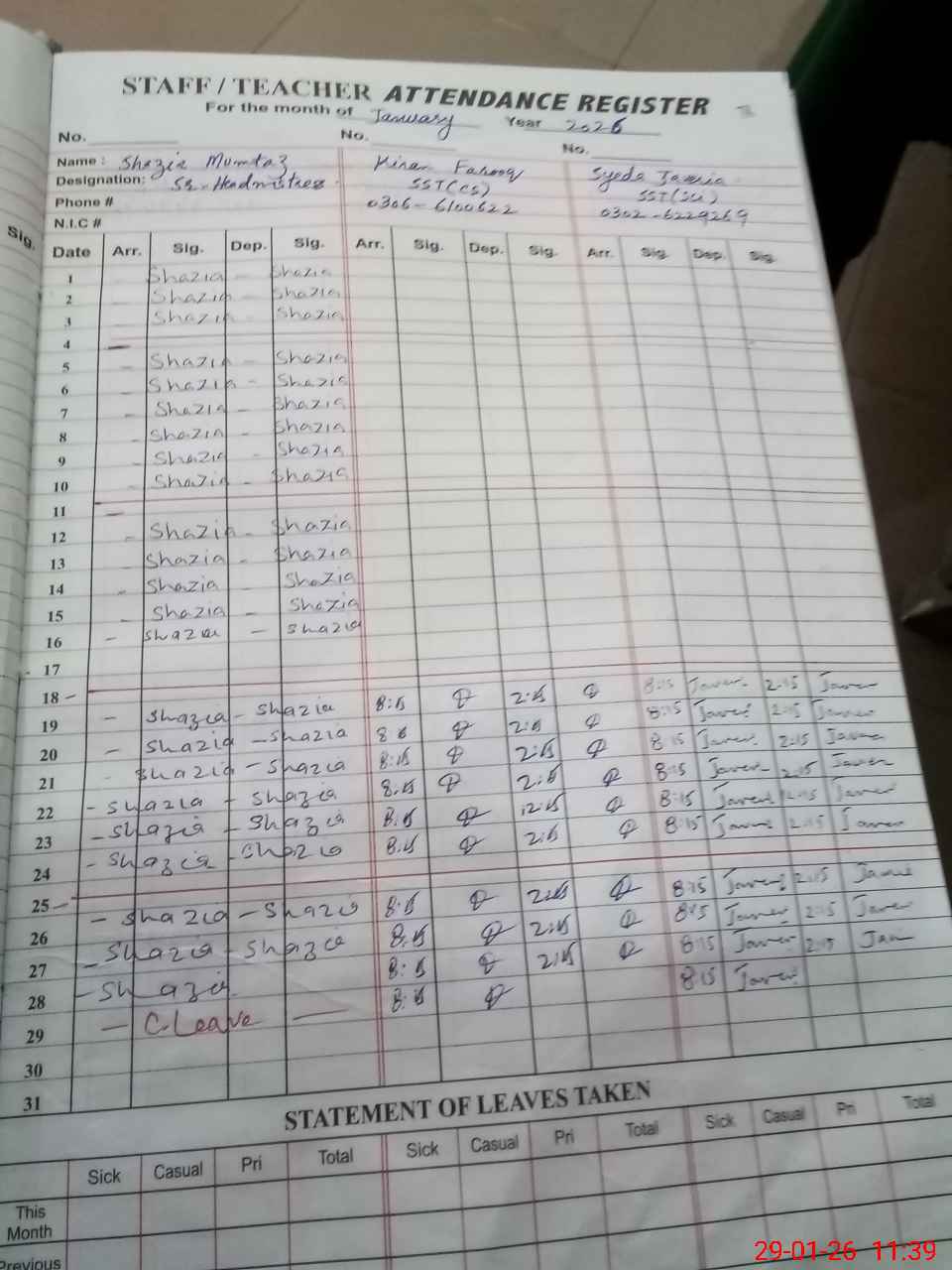 | CNIC | Full Name | Designation | R/C | Absence During Last Calender Month |