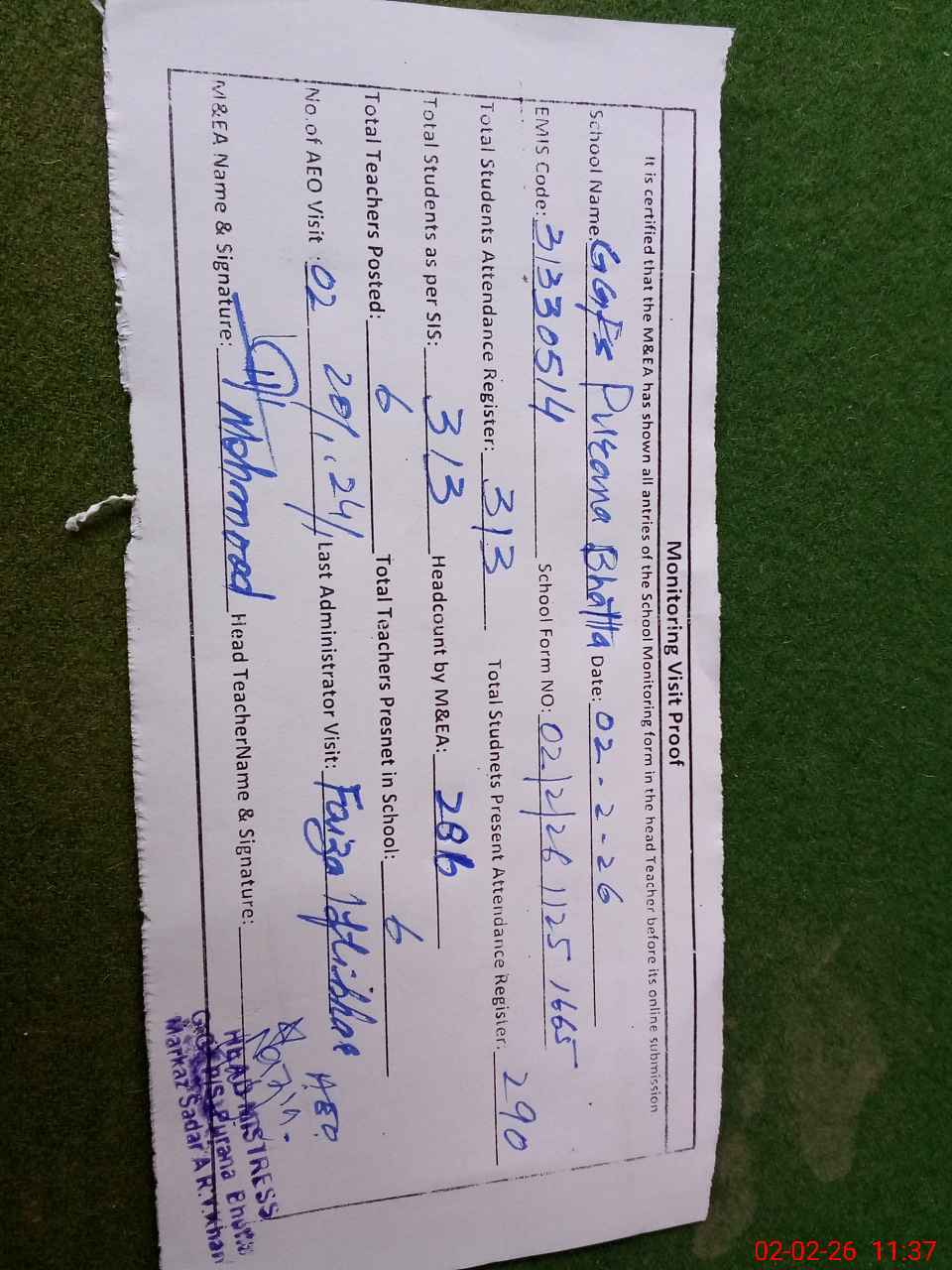 | Attendance Register | Head Teacher | MEA with School | Visit Proof |