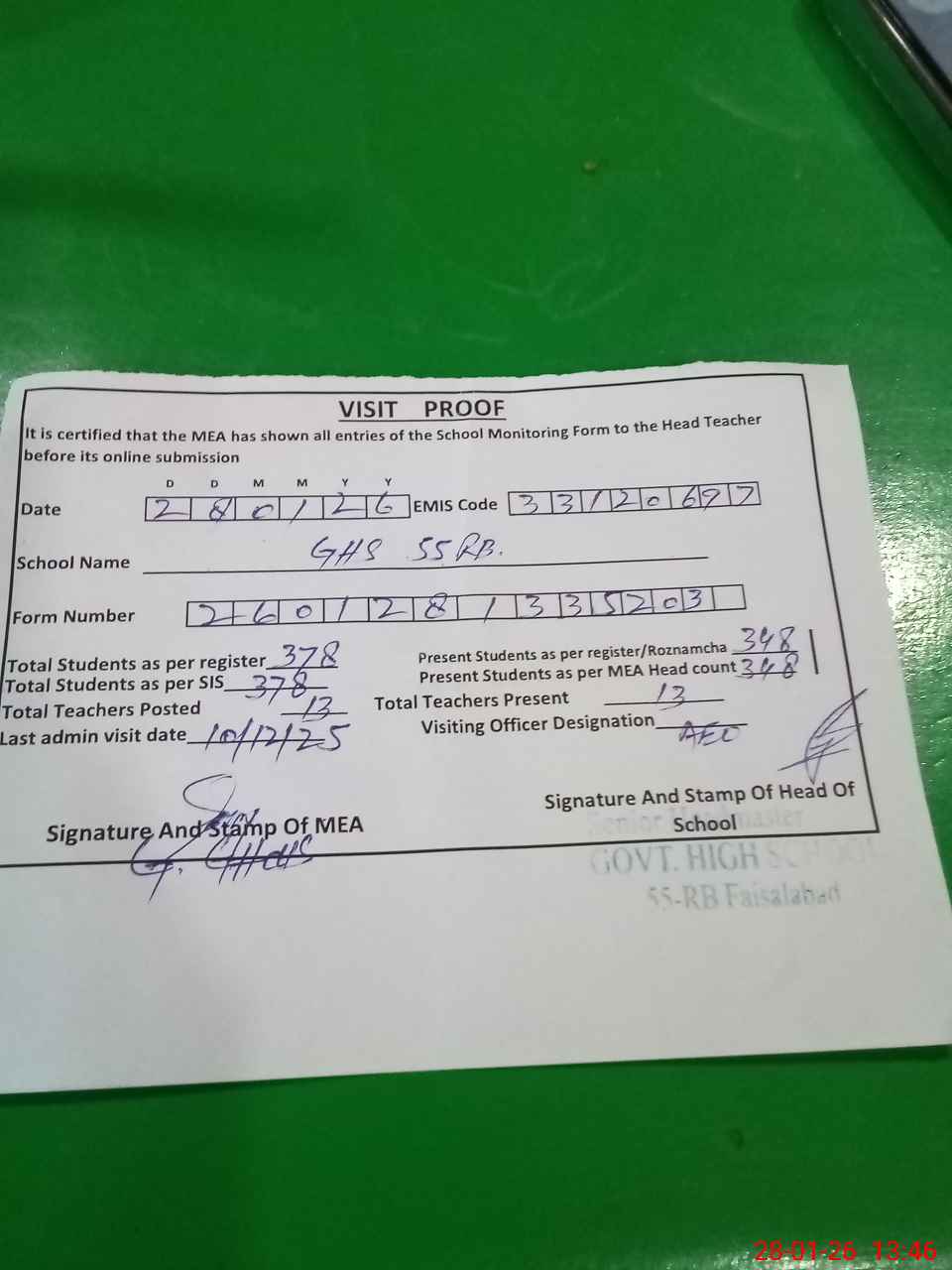 | Attendance Register | Head Teacher | MEA with School | Visit Proof |