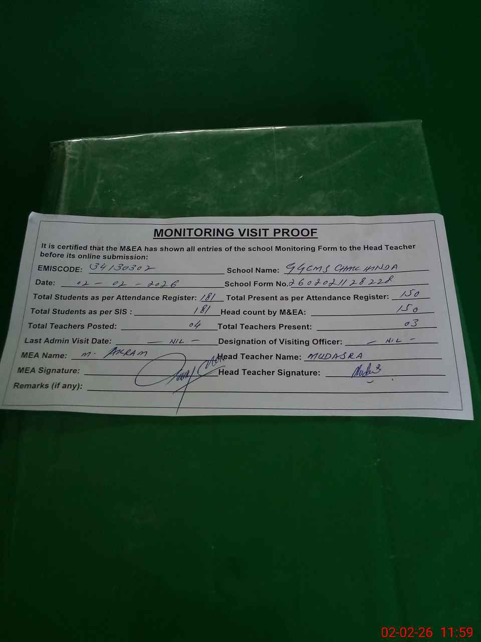 | Attendance Register | Head Teacher | MEA with School | Visit Proof |