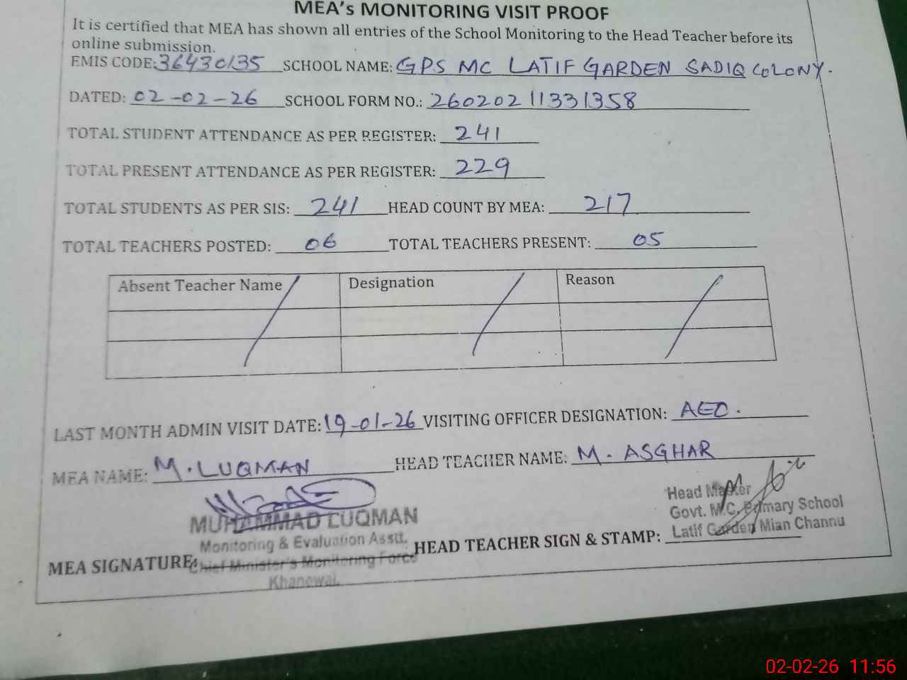 | Monitoring Date: 02-02-2026 | Start Time: 02-02-2026 10:53 AM | End Time: 02-02-2026 11:57 AM | Name of MEA: Mu**** Lu**** | |