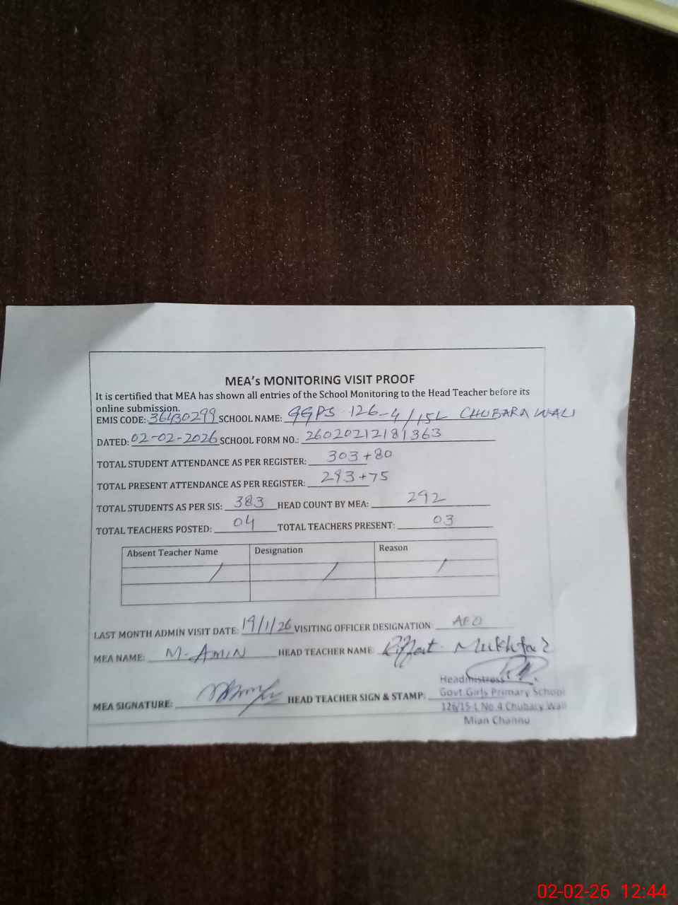 | EMIS Code: 36430299 | Name of School: GGPS 126-4/15-L CHUBARA WALI, MIAN CHANNU | |||