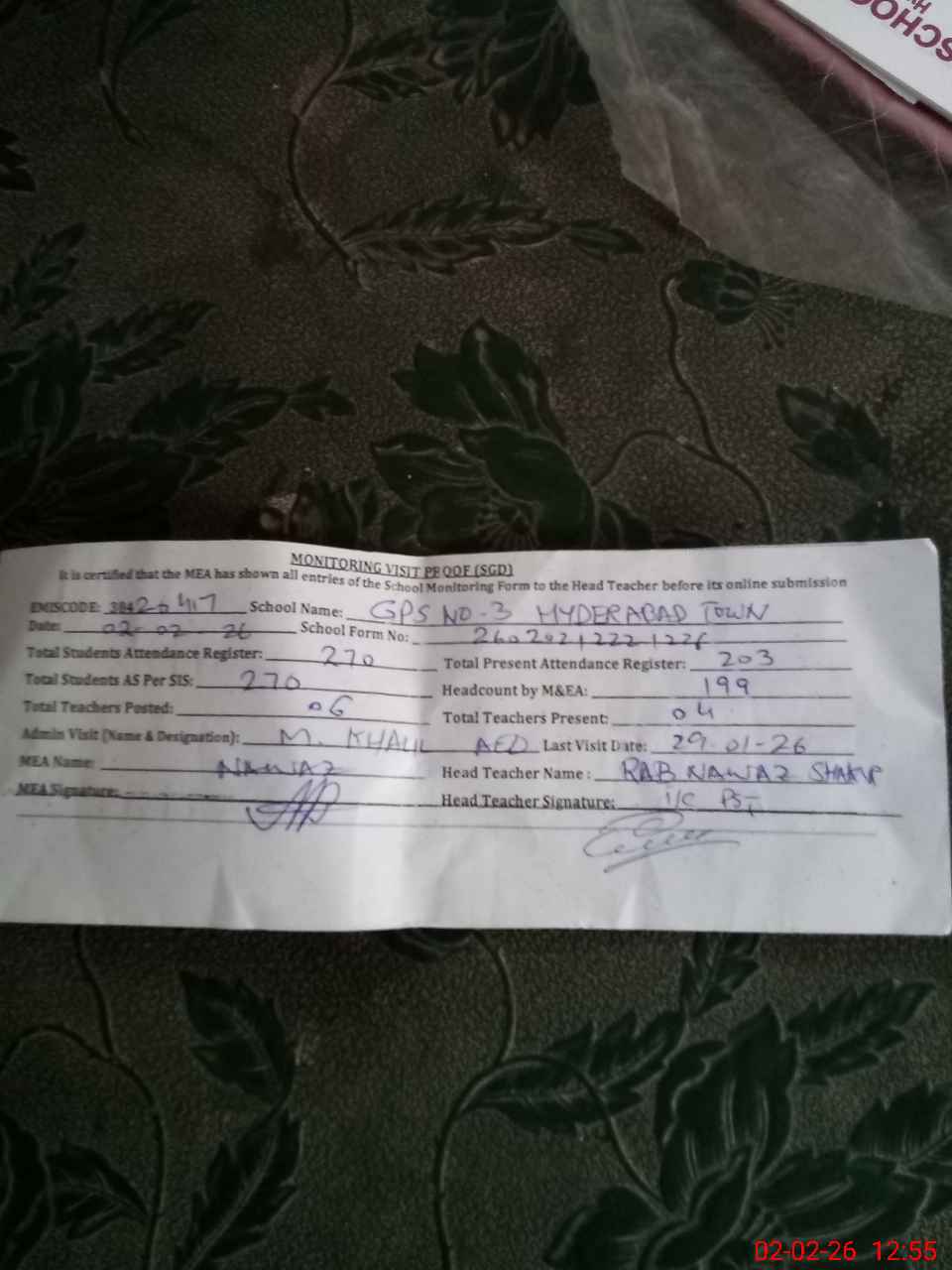 | Certified that this School was Inspected by the Undersigned MEA/DMO Today and the Information Stated Above is as Per Record. | |||||