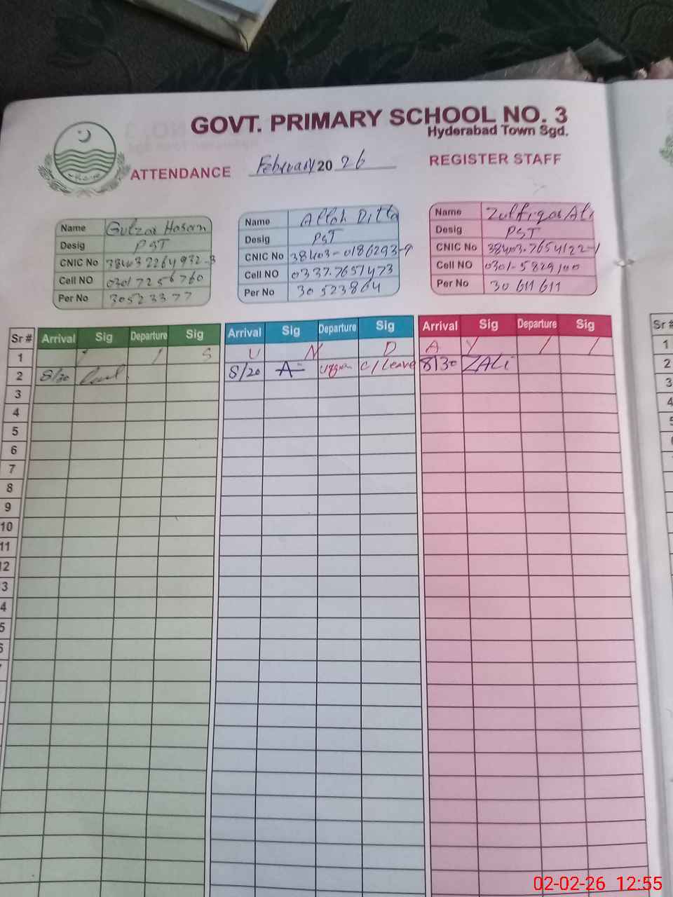 | CNIC | Full Name | Designation | R/C | Absence during last cal. month |