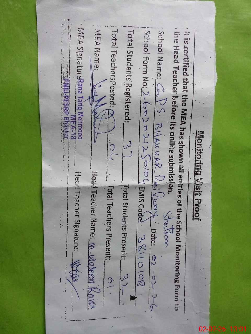 | Name: Mu**** Wa**** Ra**** Designation: (School Headmaster's/Headmistress's) PST Phone/Cell Number: 03**** |
