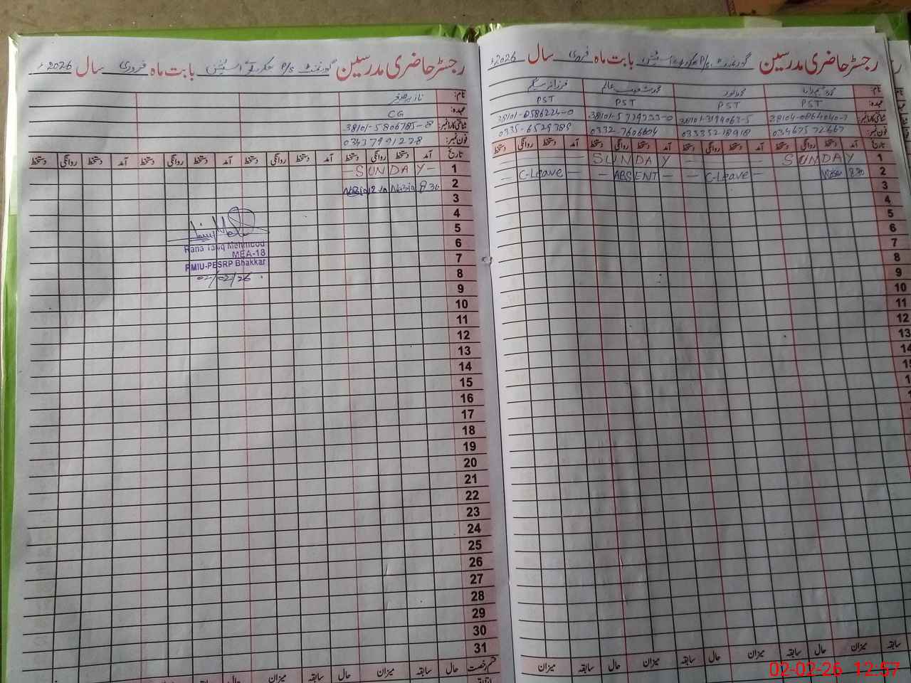 | CNIC | Full Name | Designation | R/C | Absence During Last Calender Month |