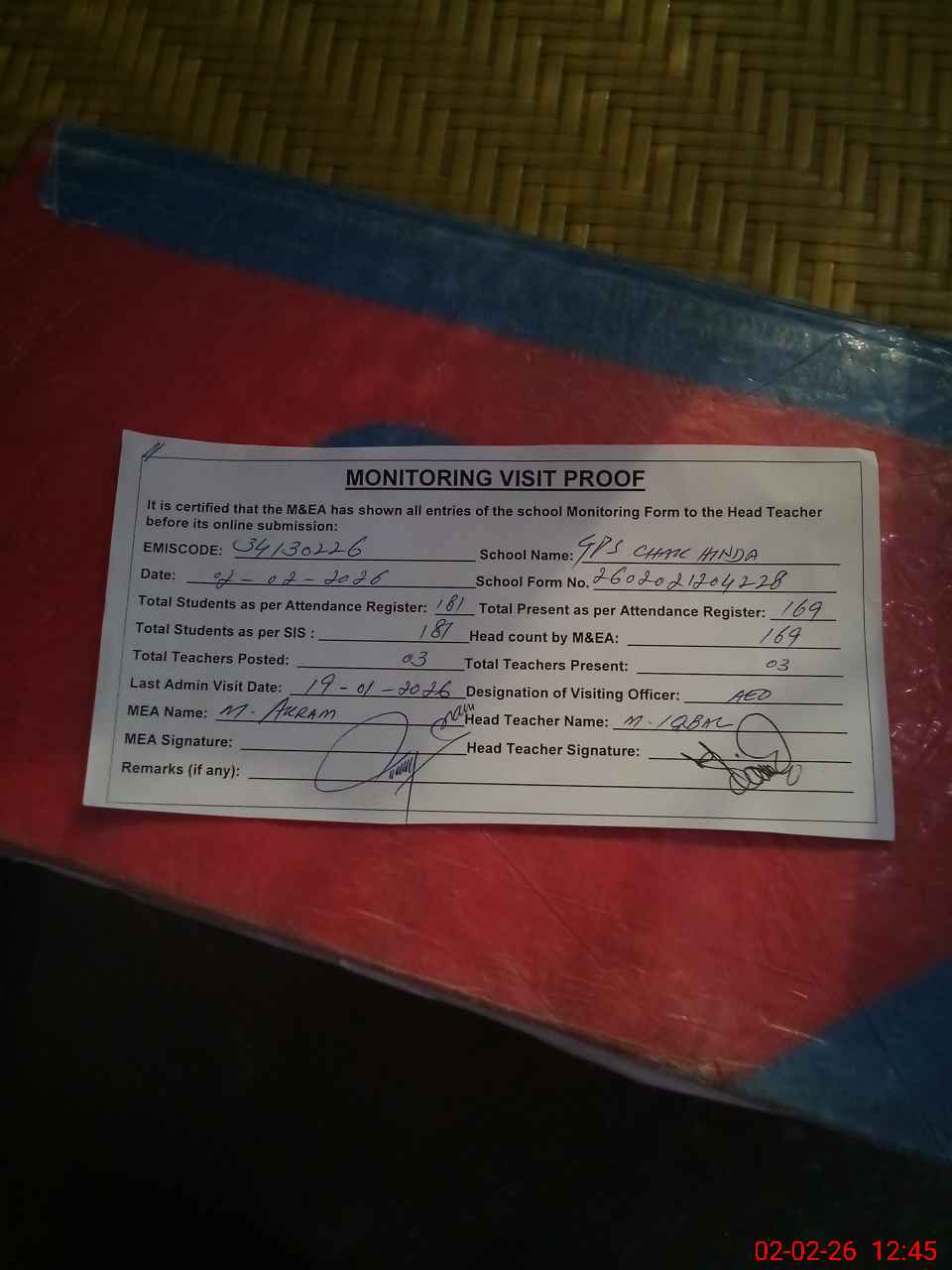 | EMIS Code: 34130226 | Name of School: GPS CHAK HINDA | |||
