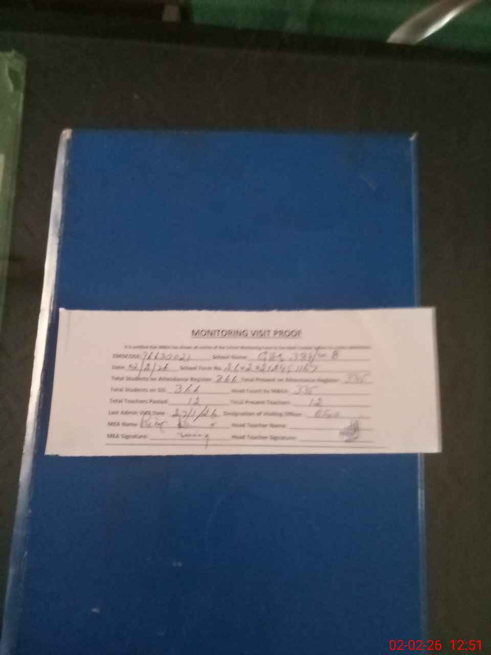 | Attendance Register | Head Teacher | MEA with School | Visit Proof |