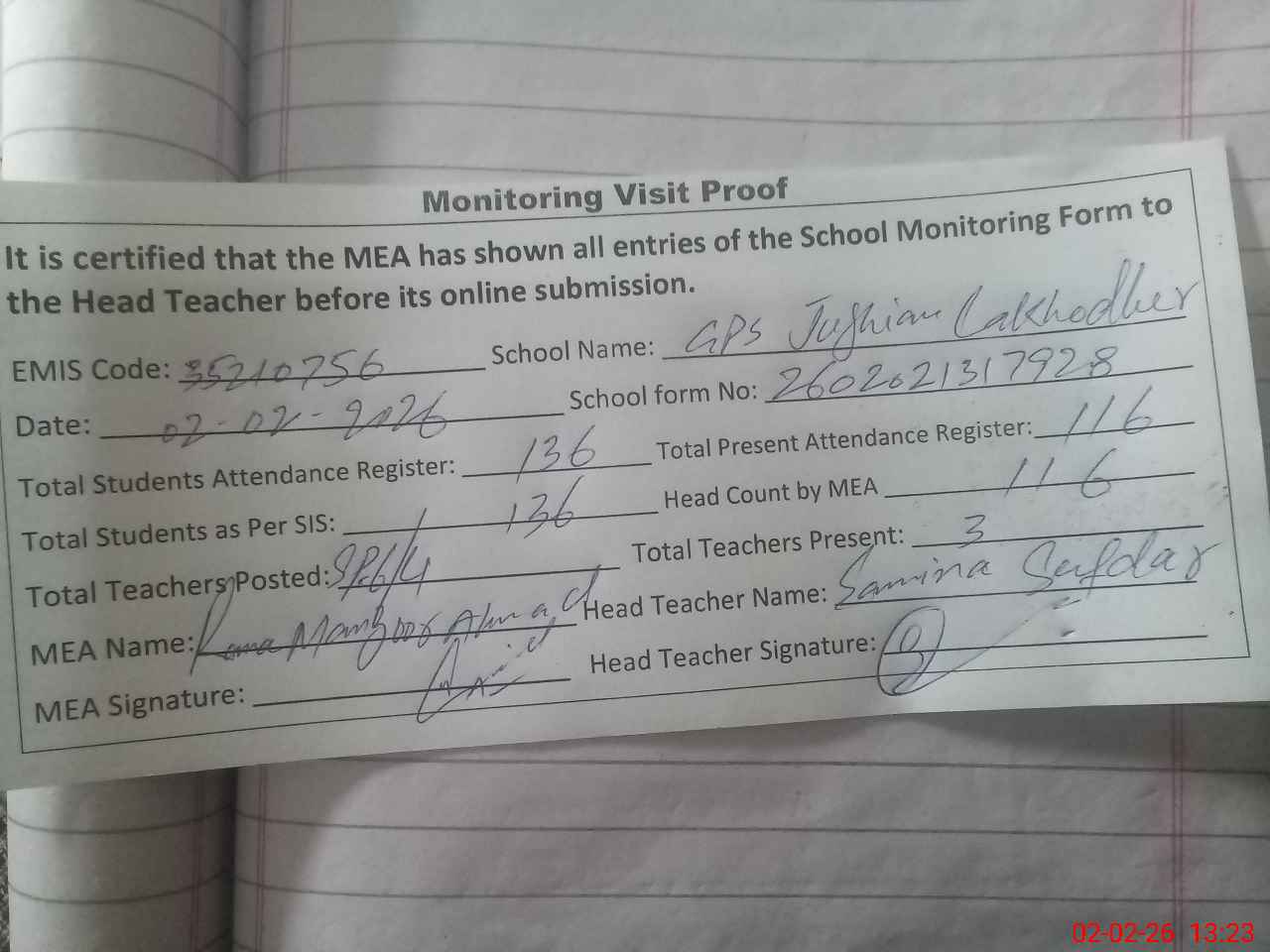 | Attendance Register | Head Teacher | MEA with School | Visit Proof |