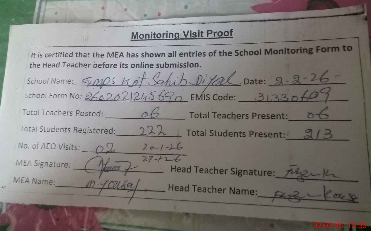 | EMIS Code: 31330609 | Name of School: GMPS KOT SAHIB DIYAL | |||