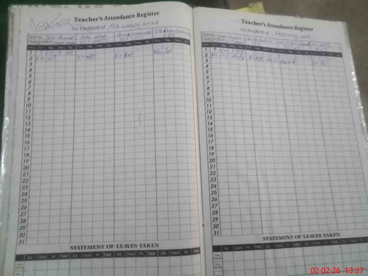 | Total no. of Classrooms: 9 No. of Classrooms Used for Teaching: 6 No. of Classrooms Storing Old Furniture, FTBs, etc: 0Comments if Any: Sir teachers and students attendance on sis not carried NSB record Cash book not maintain 02 class rooms are partially dangrous roofs only |