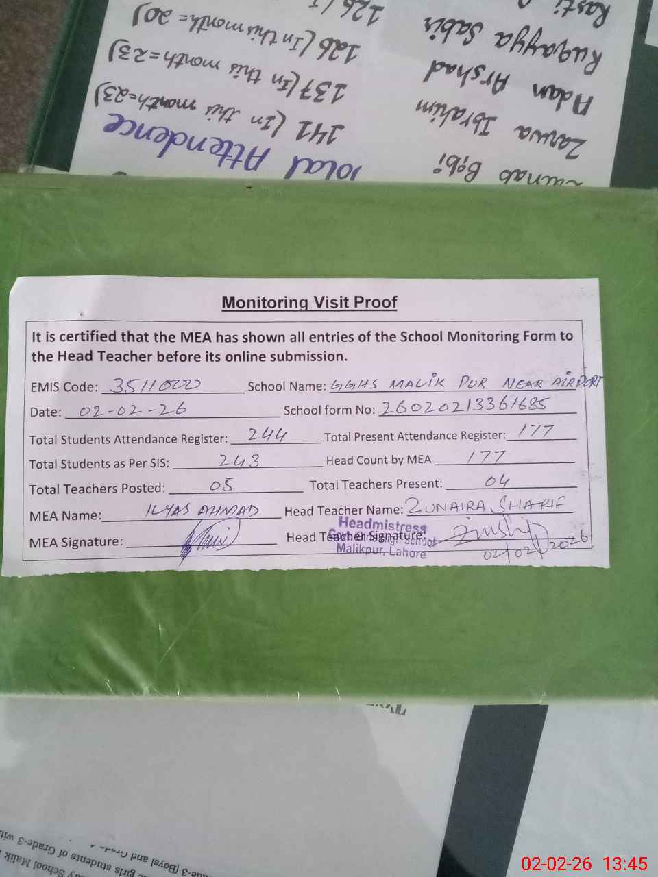 | Attendance Register | Head Teacher | MEA with School | Visit Proof |