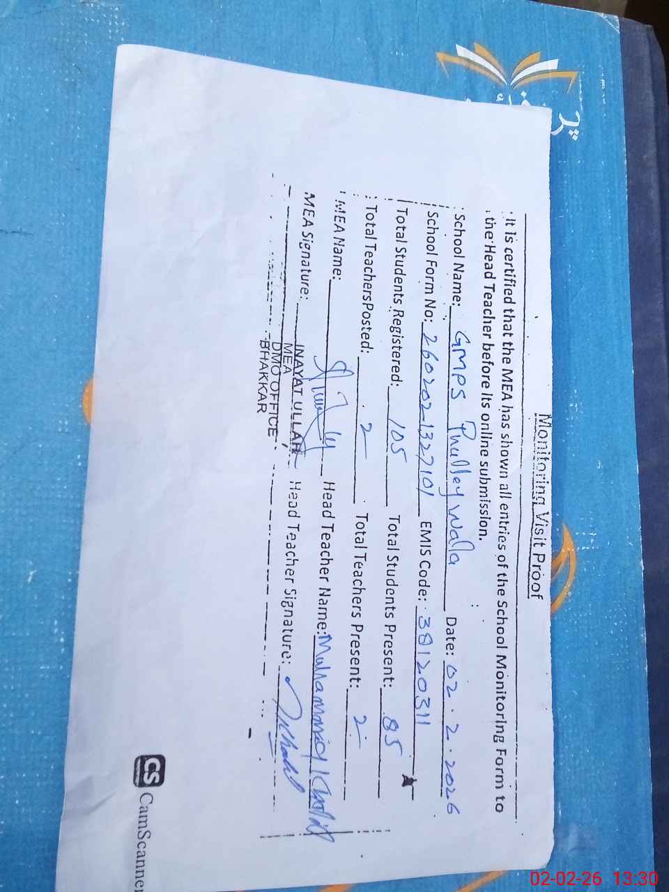 | Attendance Register | Head Teacher | MEA with School | Visit Proof |