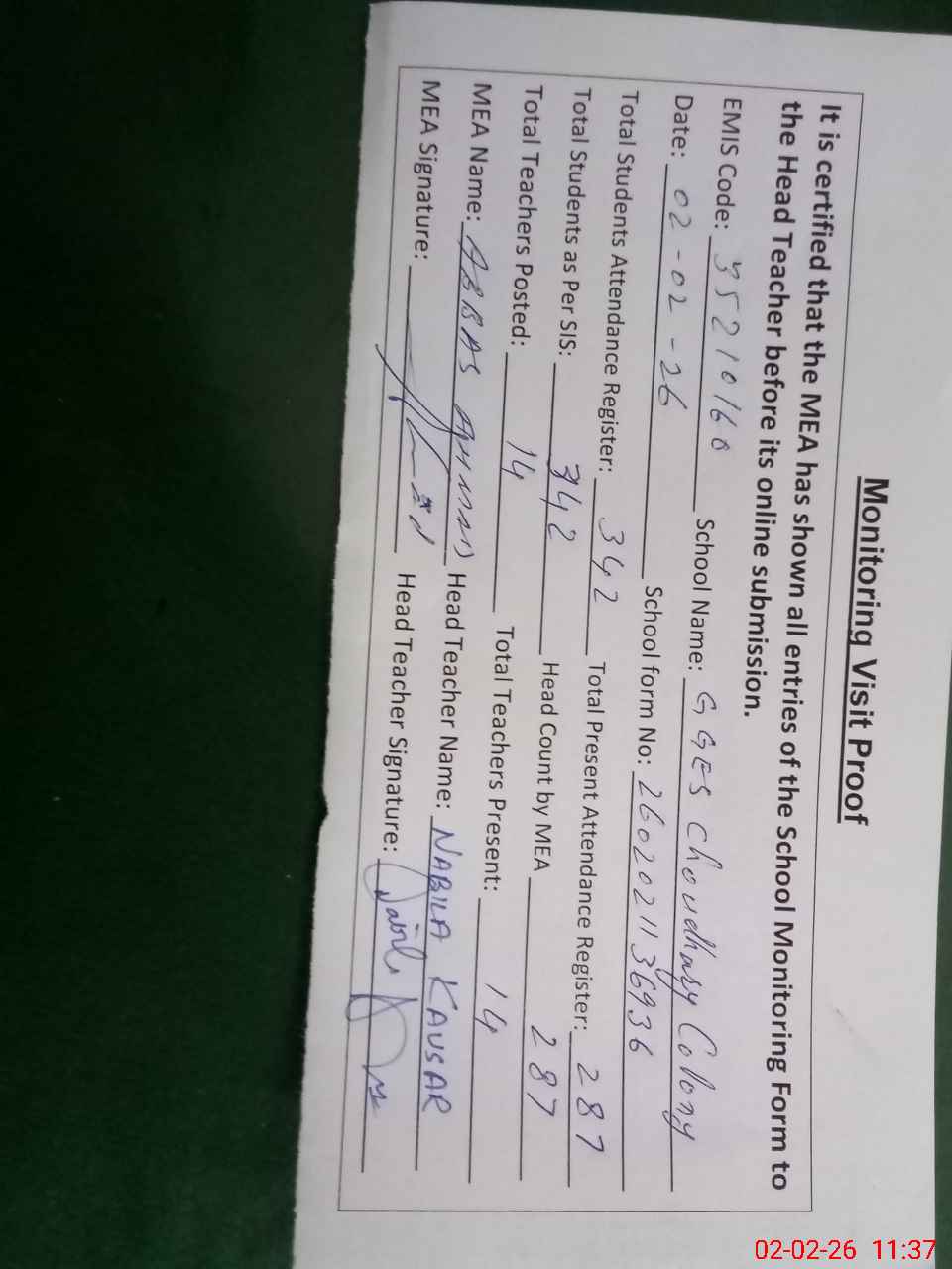 | EMIS Code: 35210160 | Name of School: GGES CHAUDRY COLONY KACHI ABADI | |||