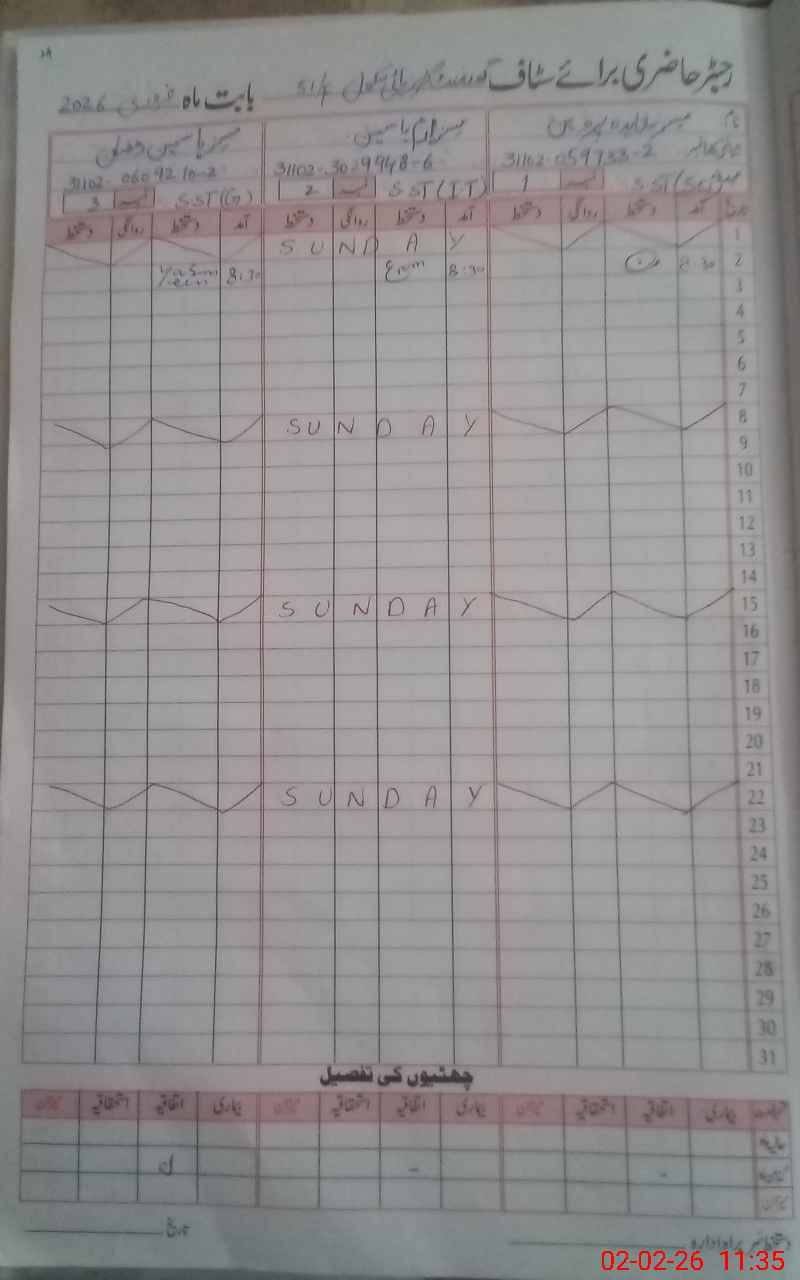 | CNIC | Full Name | Designation | R/C | Absence During Last Calender Month |