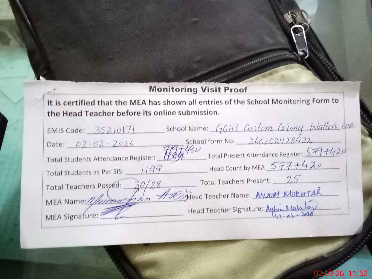 | Attendance Register | Head Teacher | MEA with School | Visit Proof |