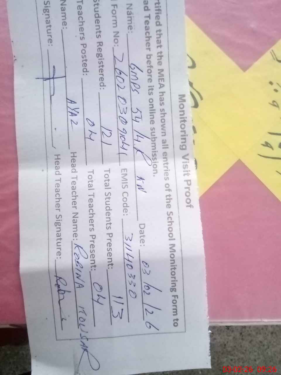 | Attendance Register | Head Teacher | MEA with School | Visit Proof |