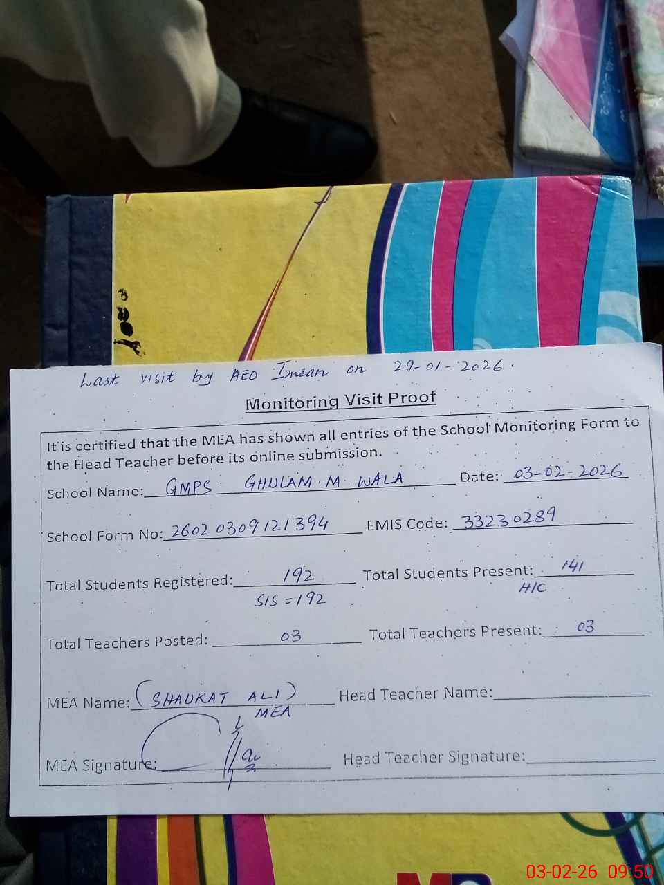 | EMIS Code: 33230289 | Name of School: GMPS GHULAM MUHAMMAD WALA | |||