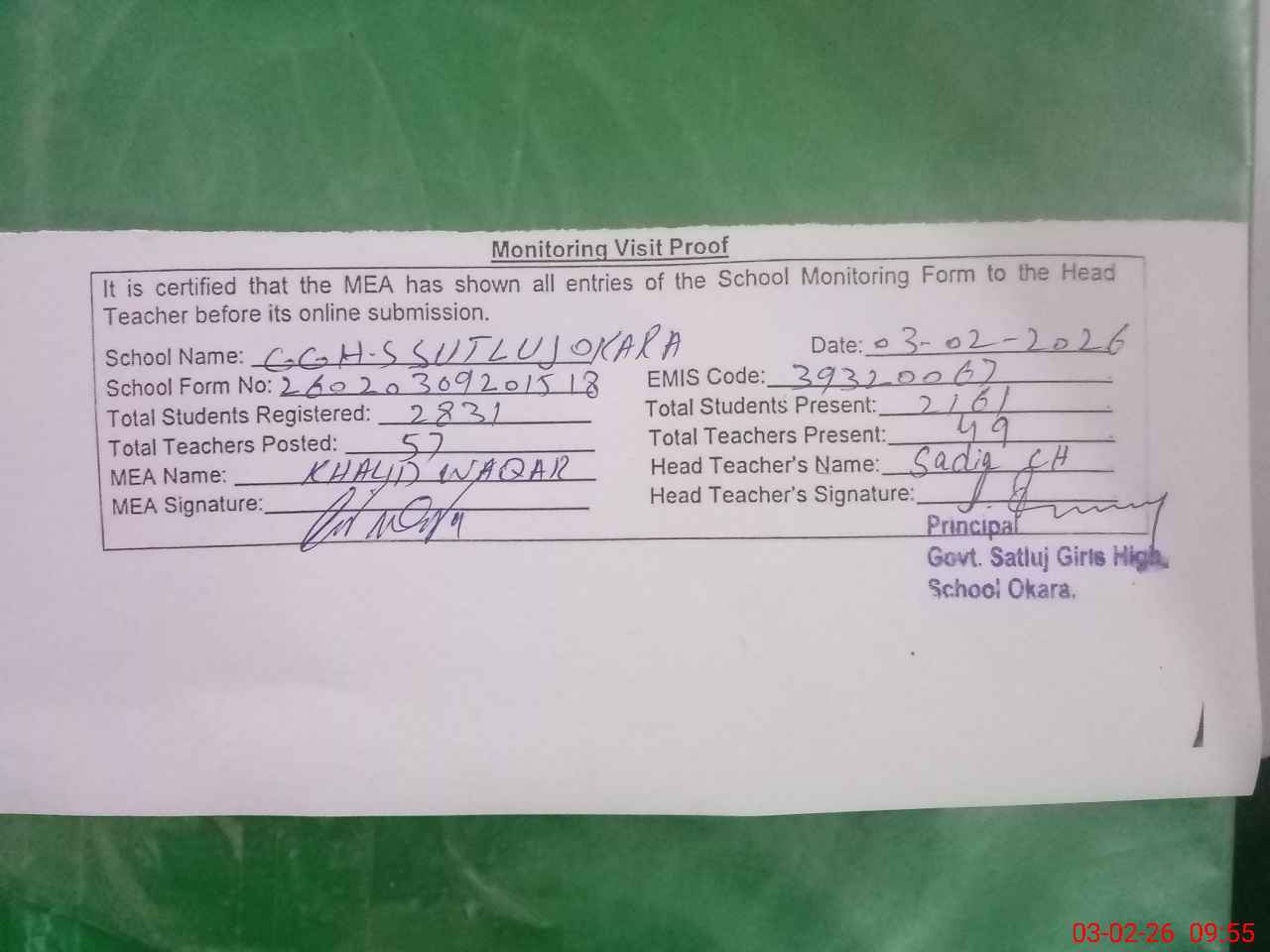| Certified that this School was Inspected by the Undersigned MEA/DMO Today and the Information Stated Above is as Per Record. | |||||