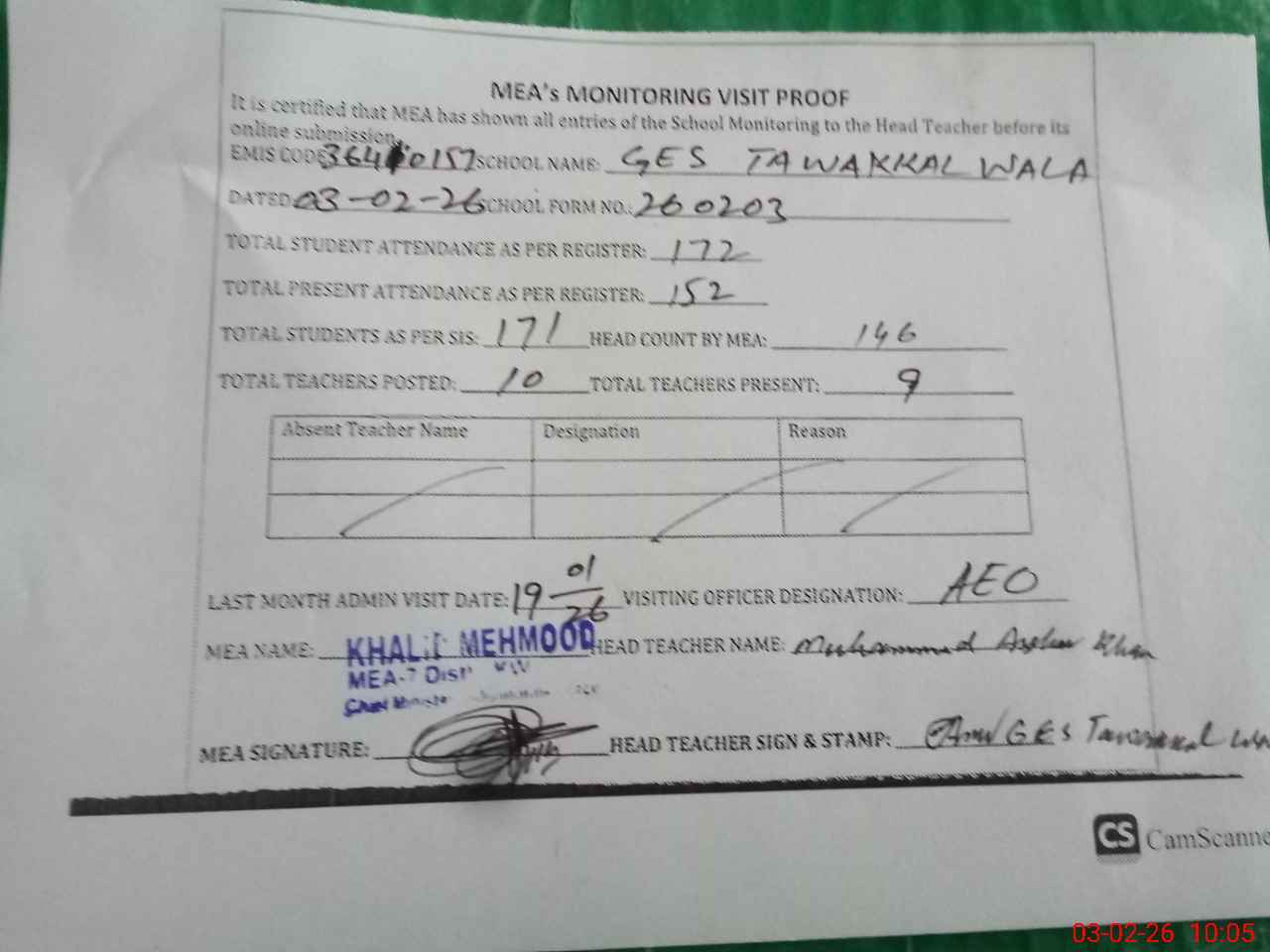 | Attendance Register | Head Teacher | MEA with School | Visit Proof |