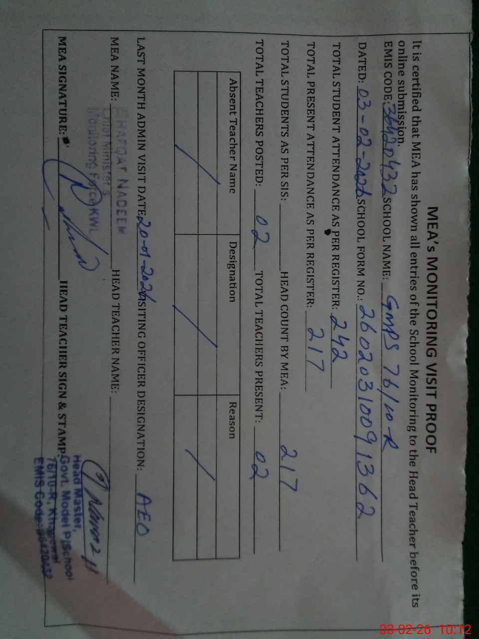 | Attendance Register | Head Teacher | MEA with School | Visit Proof |