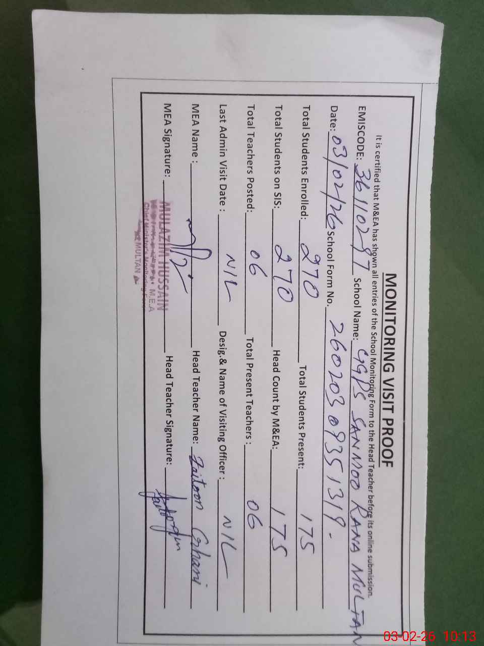 | EMIS Code: 36110297 | Name of School: GGPS SANMOO RANA NEAR SHARIF PURA CHOWK | |||