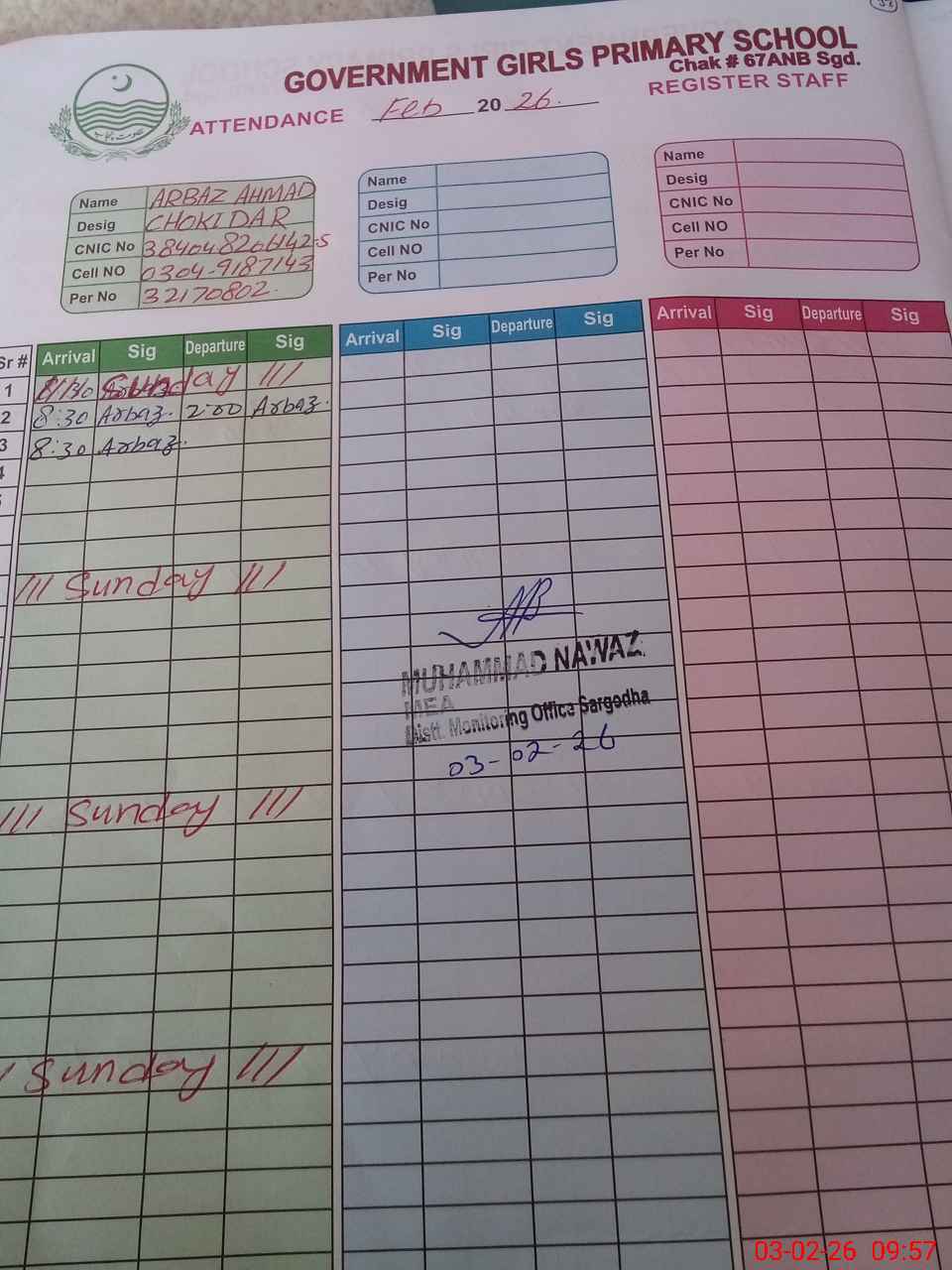 | CNIC | Full Name | Designation | R/C | Absence During Last Calender Month |
