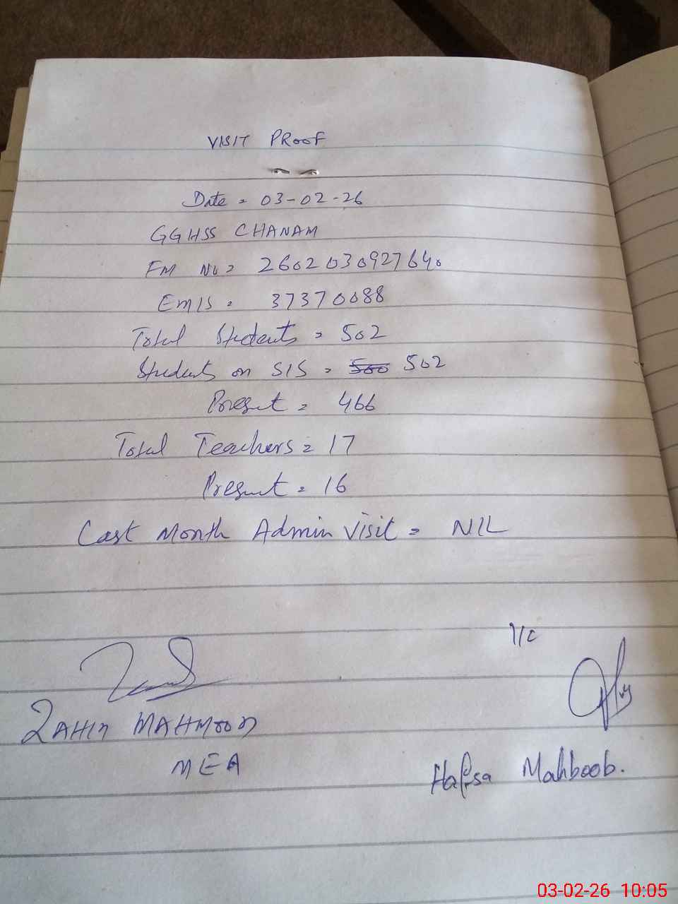 | Attendance Register | Head Teacher | MEA with School | Visit Proof |