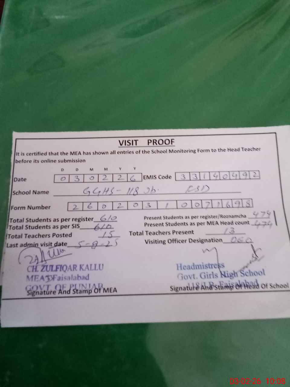 | EMIS Code: 33140492 | Name of School: GGHS CHAK 118 JB | |||