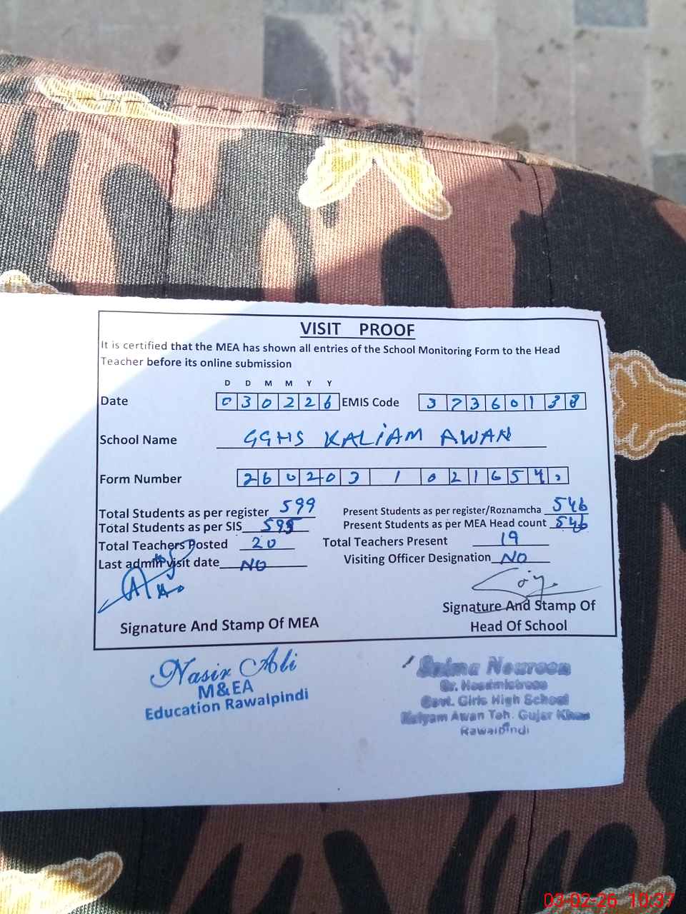 | Certified that this School was Inspected by the Undersigned MEA/DMO Today and the Information Stated Above is as Per Record. | |||||