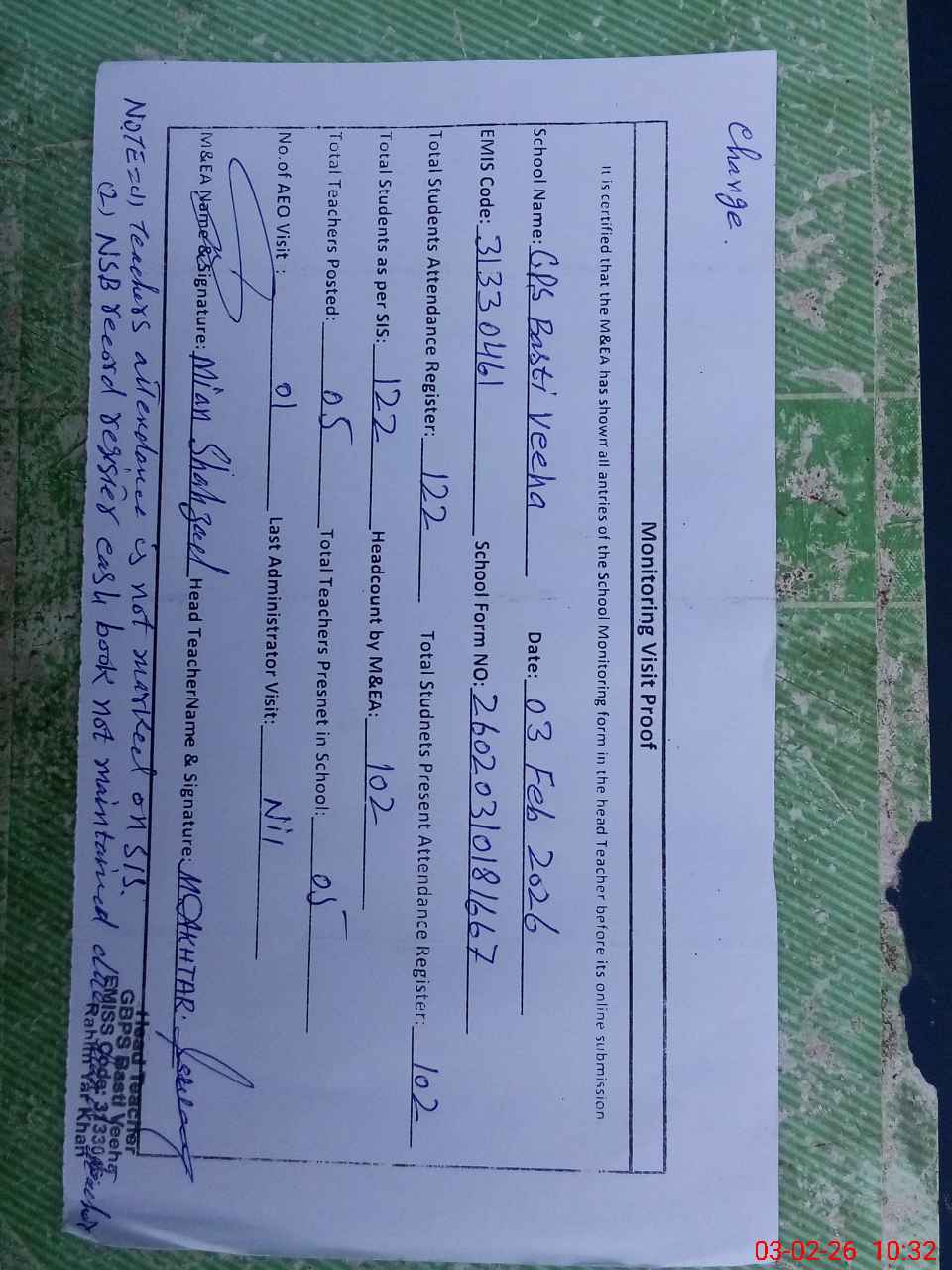 | EMIS Code: 31330461 | Name of School: GPS BASTI VEEHA | |||