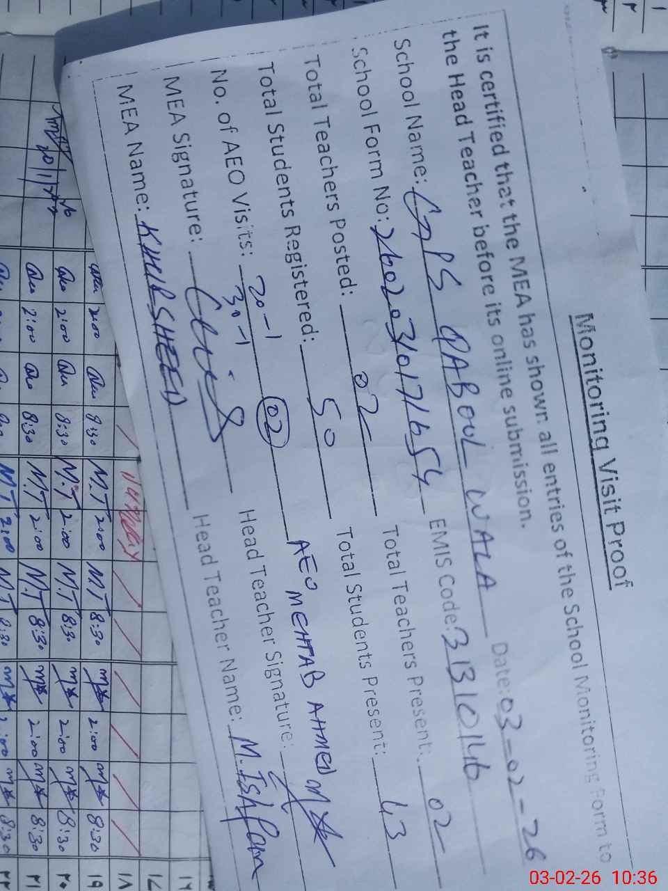 | Attendance Register | Head Teacher | MEA with School | Visit Proof |